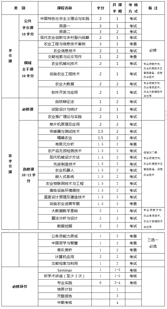 本专业课程总学分控制在38-40学分,其中学位课20学分,非学位课10-12学分,必修环节8学分。所有教学课程均应在第一学年内开设完毕。其中领域主干课有:农业工程与信息技术案例(主讲教师:陈雄飞、余佳佳、刘兆朋、刘俊安)、农业信息技术(主讲教师:赵应丁)、文献检索与论文写作(主讲教师:姚明印)、农业机械化技术(主讲教师:刘仁鑫、杨卫平、黎静、赵进辉)、设施农业工程技术(主讲教师:熊安平)、农业大数据(主讲教师:易文龙)、软件开发与应用(主讲教师:邓泓)。