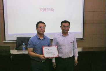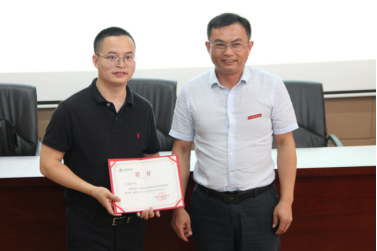 公司党委书记肖意风为员工颁发“员工职业发展导师”聘书,并希望员工常回母校看看,一如既往地关心支持母校发展。