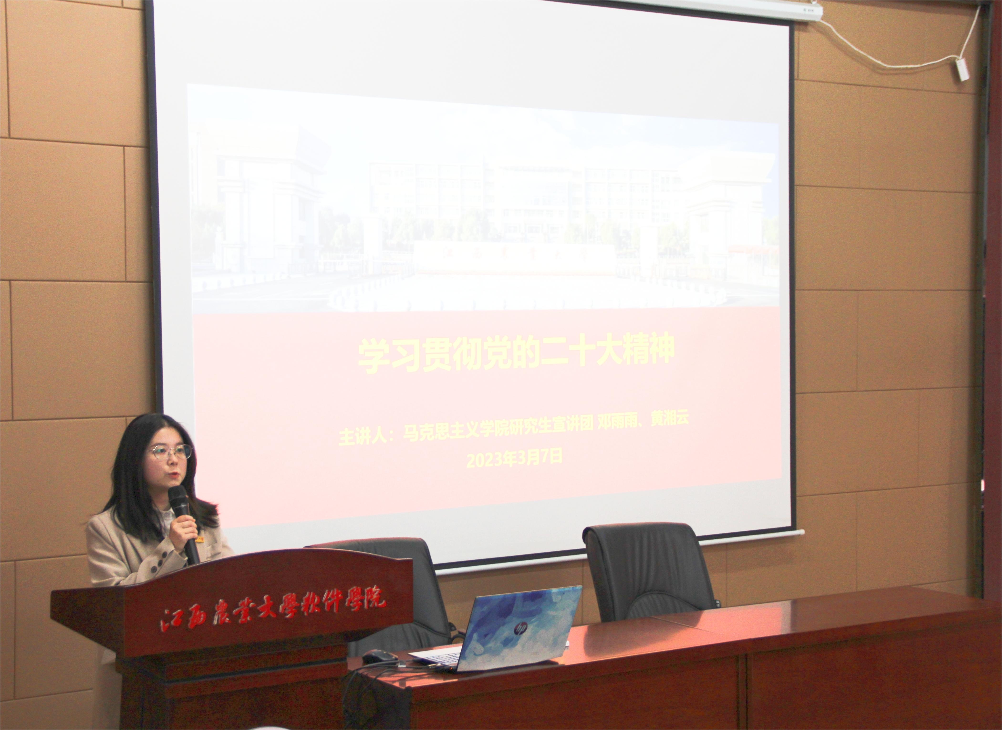3月7日下午,公司邀请马克思主义公司研究生宣讲团为公司青年员工宣讲党的二十大精神。宣讲团成员邓雨雨、黄湘云以“学习贯彻党的二十大精神”为题进行了宣讲。80余名员工在现场聆听宣讲。