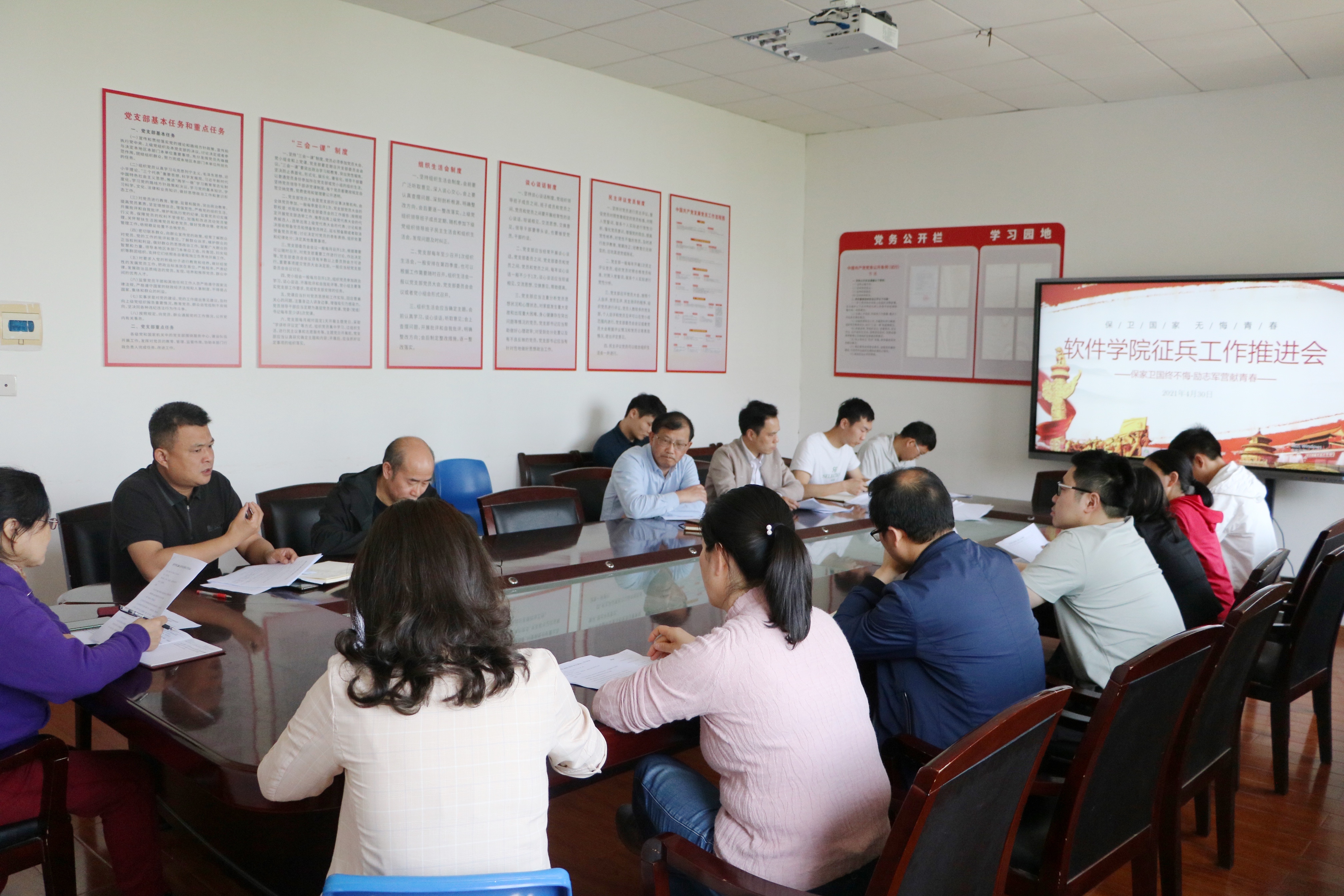 会上介绍了软件学院目前征兵工作的完成情况,详细阐述了老员工征兵国家给予的主要政策待遇。会议指出,一是要在思想上高度重视,切实提高政治站位,将老员工征兵工作作为一项政治任务,确保完成全年公司征兵工作任务;二是要认真组织学习老员工征兵优惠政策,广泛开展征兵政策的宣传教育,使员工充分认识参军入伍“政治上有进步、经济上有优待、就业上有促进、学历上能提升”,激发老员工参军报国激情;三是要抓好征兵工作中的组织落实,做好老员工征兵工作中报名、体检、政治考核等各环节的保障服务工作;四是要求各毕业班班主任要帮助毕业生认真做好职业规划,为部队输送更多优秀人才。