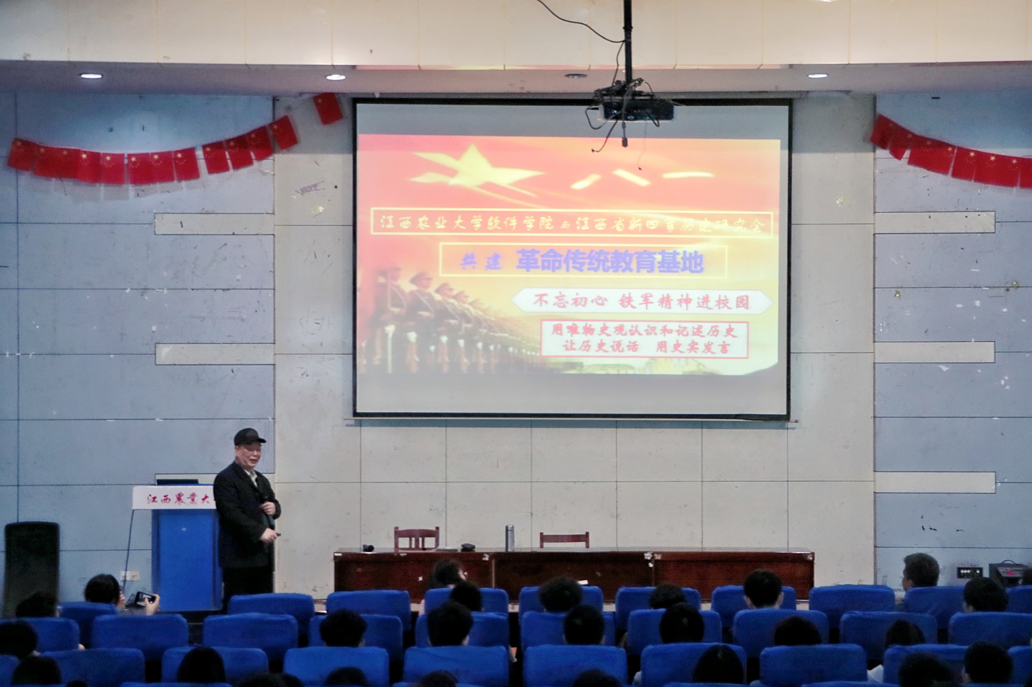 党课以一首铿锵有力地《新四军军歌》拉开序幕,“光荣北伐武昌城下,血染着我们的姓名;孤军奋斗罗霄山上,继承了先烈的殊勋.......”。军歌一开始就唱出了这支军队的历史渊源和发展脉络,从北伐军第四军到井冈山红军第四军再经历南方3年游击战,组建成新四军。随后,刘岳雄教授以新四军是什么为引,从铁的信仰、铁的担当、铁的意志、铁的纪律四个方面系统的阐述了铁军精神,带领大家重温历史,寻找初心,触摸信仰的力量,感受真理的光芒,汲取前进的动力。