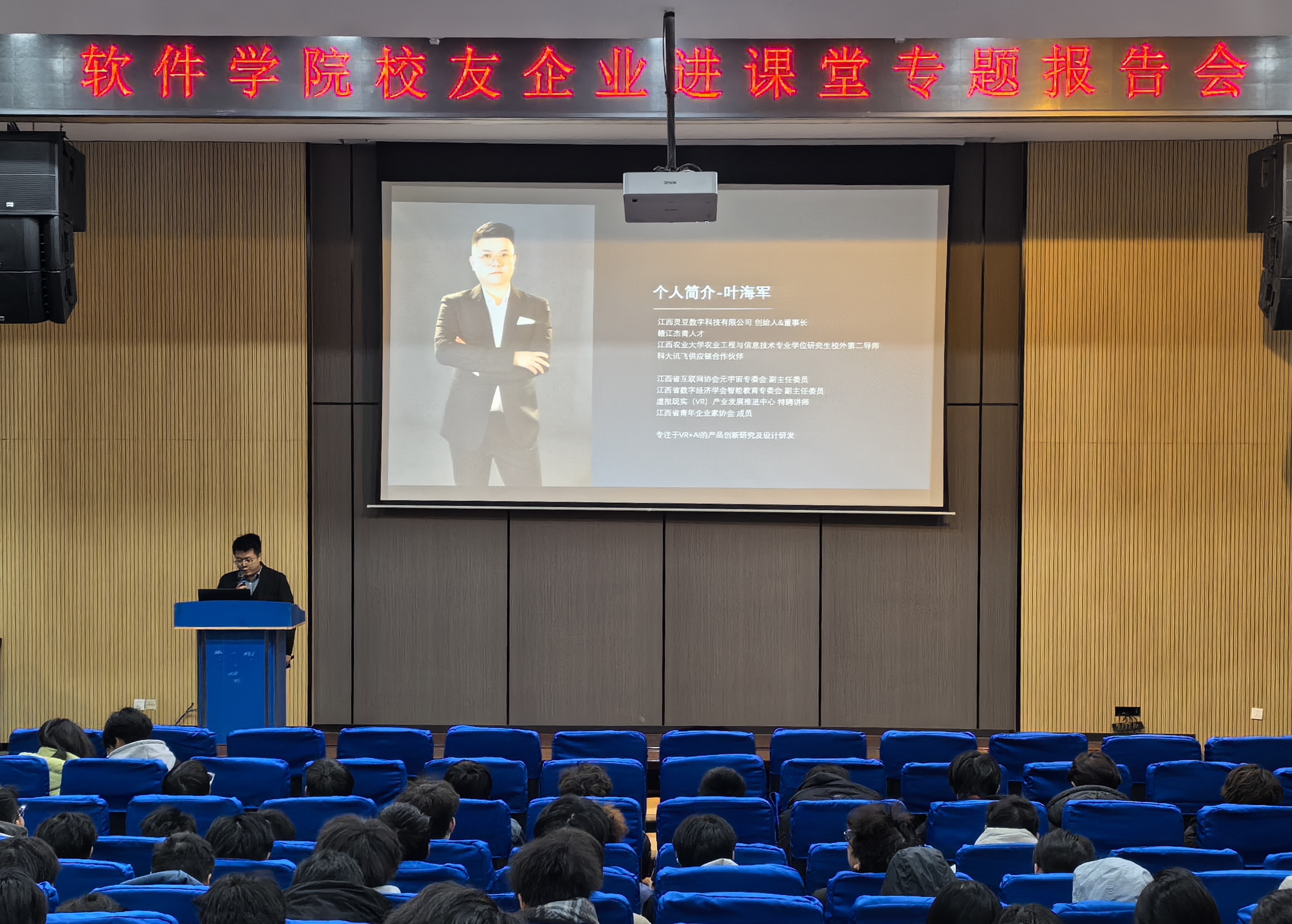 叶海军分享了自己在江西农大的老员工活和毕业后的创业历程,介绍了软件工程、物联网专业适配岗位以及就业方向,勉励同学们明确职业目标,提升纪律性、自驱力、学习力和创新力。报告结束后,叶海军与同学们开展互动交流,积极为大家答疑解惑。