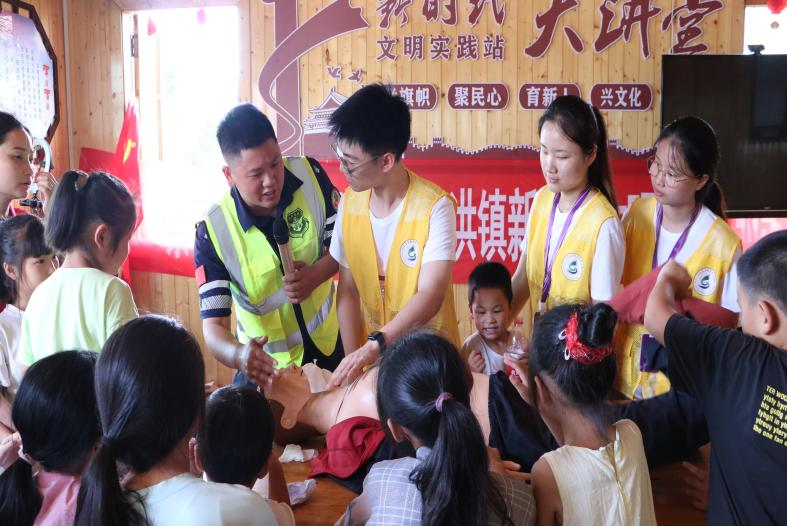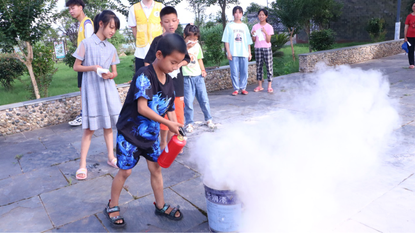 在反诈宣传活动中,实践队员和民警分工协作,利用小品、短视频、分发反诈宣传手册等喜闻乐见的方式,为村民详细讲解反诈安全知识和当前诈骗的常见手段,增强村民防范意识,提升辨别诈骗行为的能力。在防溺水安全教育活动中,实践队员们和绿舟救援队向大家介绍了预防溺水的安全知识,对溺水预防措施、自救方法、他救方法等方面进行讲解,并演示如何利用长棍、救生圈等工具对溺水者进行施救,教会当地群众掌握防溺水“一杆、一哨、一绳、一圈”的使用方法。在消防安全演练中,村民、儿童手持灭火器,现场学习如何正确操作灭火器材,手把手操作让村民们更加直观地了解火灾危害,进一步帮助村民掌握基本逃生自救技能,增强村民消防安全意识。