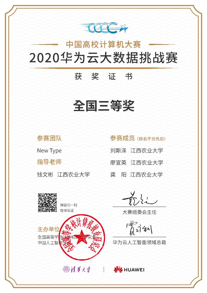 近日,第五届(2020年)“中国高校计算机大赛”落下帷幕,bevictor伟德18级软件工程专业大数据方向员工刘斯泽、廖宣英、龚阳组成的“New Type”团队在指导老师钱文彬博士的带领下代表公司参赛并取得该赛事大数据挑战赛全国总决赛三等奖的好成绩。