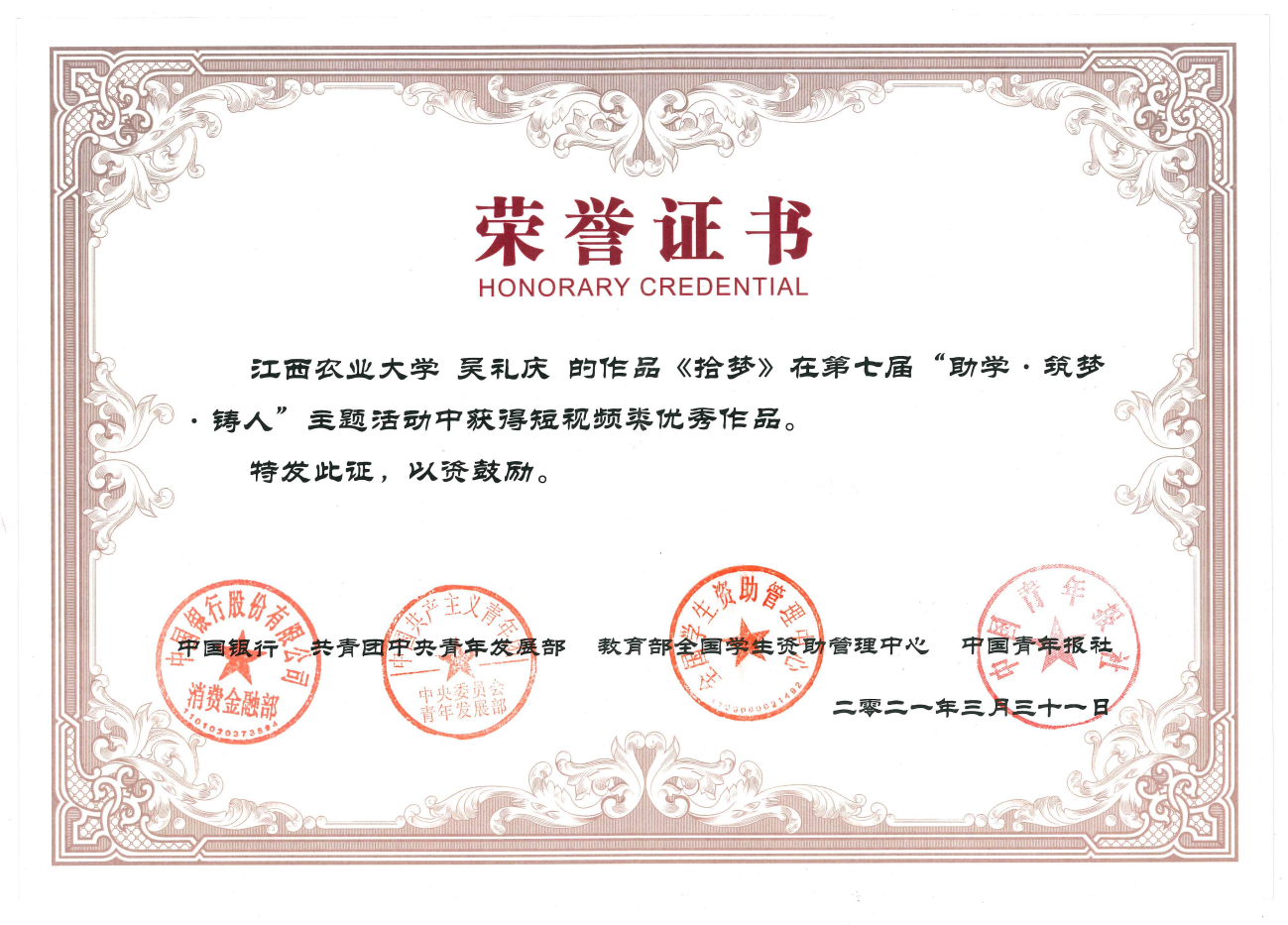 在教育部全国员工资助管理中心等单位联合举办的第七届“助学·筑梦·铸人”主题活动优秀作品评选中,公司软件1804班吴礼庆同学的短视频作品《拾梦》荣获优秀作品称号。